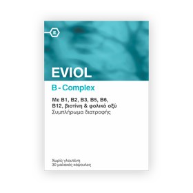 Το συμπλήρωμα διατροφής EVIOL B-Complex περιέχει όλες τις πολύτιμες υδατοδιαλυτές βιταμίνες του συμπλέγματος B που συμβάλλουν στη φυσιολογική λειτουργία του νευρικού συστήματος.